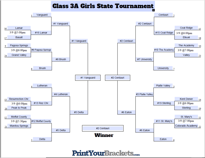 Coal Ridge moved into the sweet 16 with a 59 to 37 win over Ellicott. Coal Ridge had a dominate second half outscoring Ellicott 39 to 16. Coal Ridge had big performances by Jackie Camunez and Taylor Wiescamp. Coal Ridge will now look for an upset of the #2 team. Centauri enters the playoffs with a 13-1 record and winners of the Intermountain League. Centauri lone loss of the season is to #1 Vanguard. Centauri ended the season on a 6-game winning streak including solid wins over Pagosa Springs and Sanford. I am going with Centauri over Coal Ridge. I think Coal Ridge must have big games from Camunez and Wiescamp but Centauri defensive pressure will be key in this game. I have Centauri pulling away in the second half.