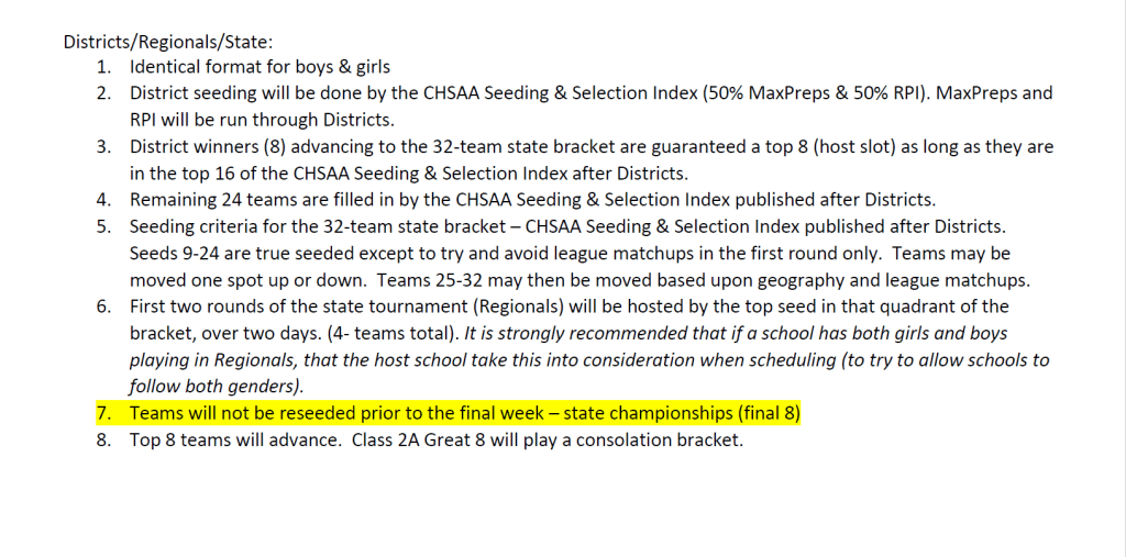 We look towards District Tournaments. District Tournaments are just 2 weeks away and things are coming down to the wire. Looking at the Basketball Bulletin all District Tournaments will be seeded by the CHSAA Seeding & Selection Index. (Picture below)